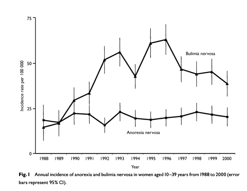 In the UK, British researchers studying eating disorders during the 1990s found the rate of bulimia among women exploded. But in 1997, it started to decline. Below is a horrendously dull-looking chart from a study on this idea.
